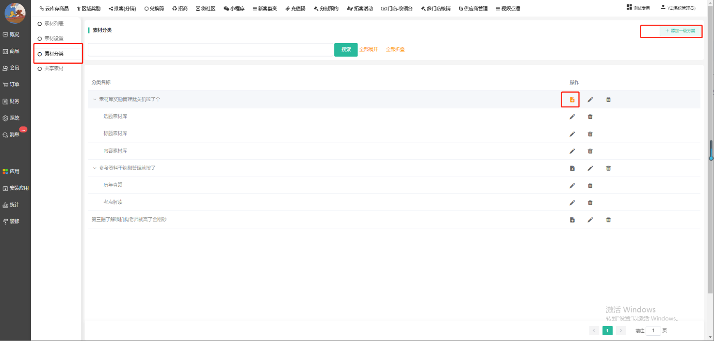 添加一级分类,添加后支持在一级分类下继续创建添加二级分类(添加好分类后才可以进行发布素材)