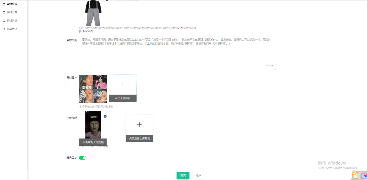1.素材列表添加素材:设置好素材标题,关联的商品只能选择一件(支持平台所有商品),素材文案,上传好商品图片(图片最多只能上传9张),选择是否显示(选择显示则保存后在前端就可以查看到)