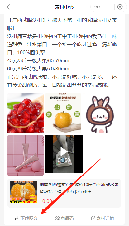 4,前端会员中心—素材中心,点击进去可以查看到后台发布的素材,前端会显示素材文案,素材商品图片,关联的商品