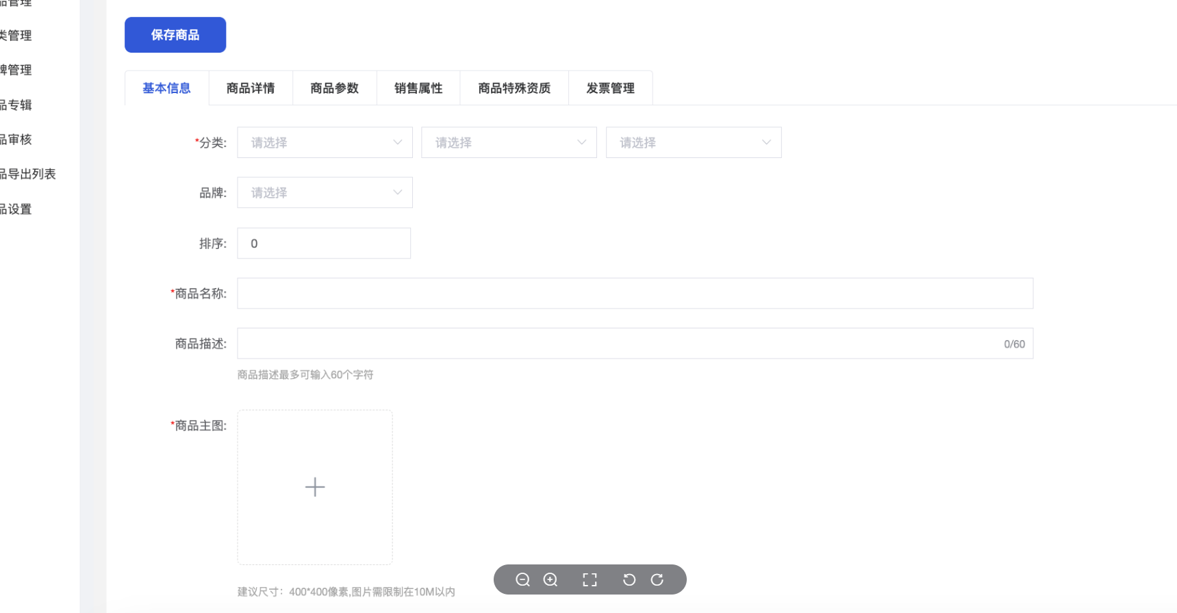 如果商品有特殊的资质展示,可以在这里单独上传,前端商品详情页--商品资质中会单独显示商品资质。