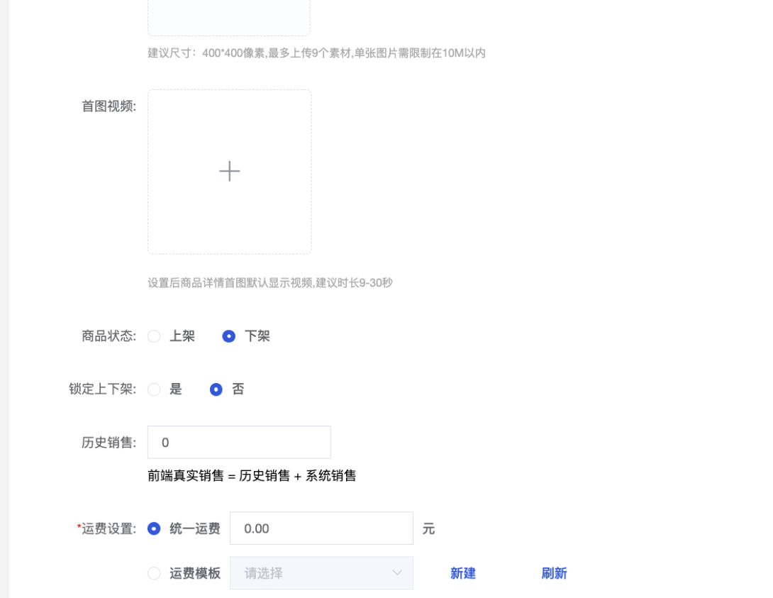 • 历史销量:可填写商品历史销量,前端显示的商品销量为历史销量+当前系统销量。