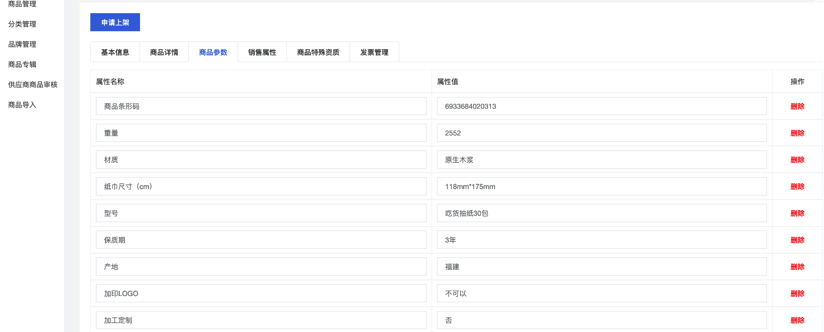 可以添加多个字段的商品参数信息。