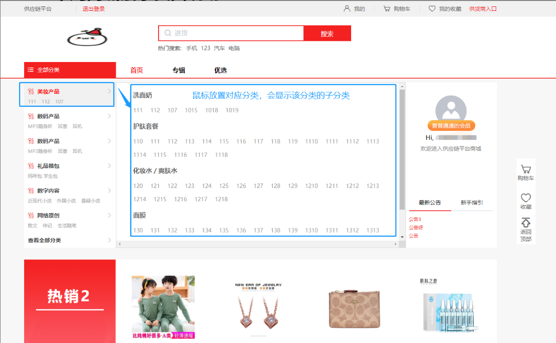 当鼠标滑进分类时会显示子分类进行选择。(首页展示分类固定数量限制,所以后端不易选择太多,否则超过部分不会显示在首页)。