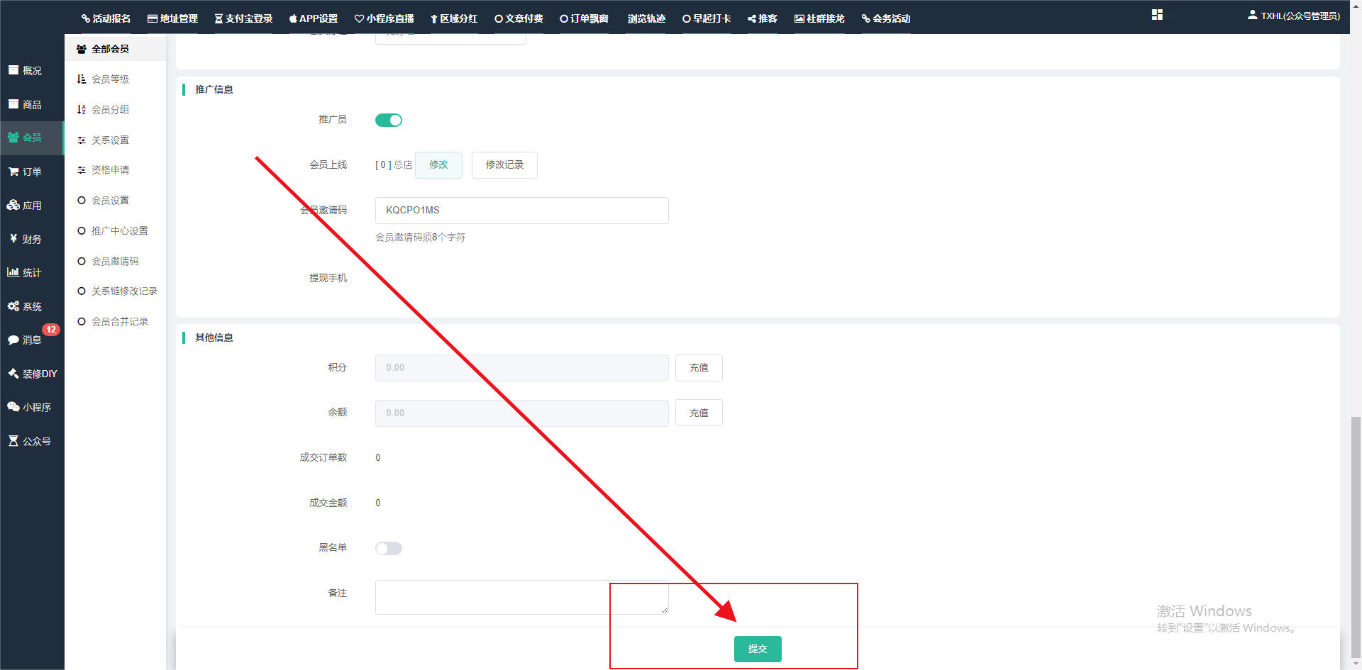 目录 搜索 展开 一、前期准备资料二、数字乡村码-上线操作指南1、服务号的申请流程及认证2、申请小程序流程3、开放平台绑定小程序和公众号三、数字乡村码-系统操作数字乡村码系统管理-概况数字乡村码-商品管理1、发布商品2、商品列表3、商品表单4、商品分类5、品牌管理6、配送模板7、评论管理8、优惠券管理9、商品标签10、退货地址设置11、满额优惠12、批量操作13、配送方式14、基础设置15、商品隐藏四、数字乡村码-会员管理1、全部会员2、会员等级3、会员分组4、资格申请5、会员设置6、推广中心设置7、会员邀请码8、会员关系链修改关系链修改记录9、会员合并记录10、账号注销管理11、会员设置中心五、数字乡村码-订单管理1、订单管理列表2、订单处理流程3、订单状态4、订单修改价格5、订单退款退货6、多包裹发货7、批量发货订单操作步骤8、催发货订单9、物流查询六、数字乡村码-财务管理1、余额设置2、会员余额3、充值记录4、转让记录5、余额明细6、收入明细7、提现设置8、提现统计9、积分管理10、转账审核11、收益广告12、批量充值七、数字乡村码-系统管理1、商城入口2、商城设置①、商城设置②、订单设置③、物流查询④、短信⑤、联系方式⑥、分类⑦、优惠券⑧、分享⑨、幻灯片⑩、广告位⑫、地图设置3、交易设置4、微信模板消息自定义消息模板(新版)自定义消息模板(旧版)小程序消息模板公众号模板消息变更公告5、语言设置6、权限管理7、多媒体管理八、数字乡村码-消息管理九、数字乡村码-应用管理十、数字乡村码系统-数据统计十一、数字乡村码-页面装修DIY1、模板管理2、店铺页面3、顶部导航4、底部导航5、DIY模板市场6、首屏广告7、基础设置8、装修DIY尺寸建议十二、供应商功能插件操作指南1、供应商2、门店-收银台门店申请和使用步骤门店管理①、门店-收银台 营销设置②、门店-收银台 分润设置门店分类门店申请门店审核门店商品门店商品订单收银台订单数据统计核销员基础设置默认设置门店装修3、微社区4、会务活动十三、营销插件操作指南活动报名提货卡新人奖微店问卷调查积分视频分享1、视频分享基础设置2、视频分享发现管理3、视频分享分类管理4、视频分享评论管理5、视频分享分红记录6、视频分享短视频中心每日红包幸运大抽奖签到优惠券二维码任务奖励优惠劵文章音频文章付费文章限时购新海报拓客卡操作流程积分活动素材中心视频红包十四、入驻门店应用类1、门店预约2、附近商品3、门店定位设置4、门店控制5、门店满额包邮6、门店满额减7、导入商品8、门店搜索9、门店股东10、核销券11、多门店核销1、商城后台设置2、前端功能演示十五、常见问题1、后台登录密码修改流程2、会员-余额,积分,后台如何进行充值与扣除3、如何修改上下级关系4、一种万能的获取商城小程序路径的方法 暂无相关搜索结果! 阅读次数:1905 本文档使用 模王系统 发布 3、如何修改上下级关系 如何修改上下级关系一.如何修改上下级关系?1.会员-全部会员-可以通过搜索用户的独立ID,或者用户微信昵称,找到此会员,然后点击右边的(操作)2.再点击会员详情。3.滑到下面,有个推广信息-会员上线,点击修改4.输入上级的ID号,点击搜索,出来此上级会员后点击选择。5.滑到最下面,一定要点击提交按钮。文档更新时间: 2024-01-05 14:50 作者:链上旅行
