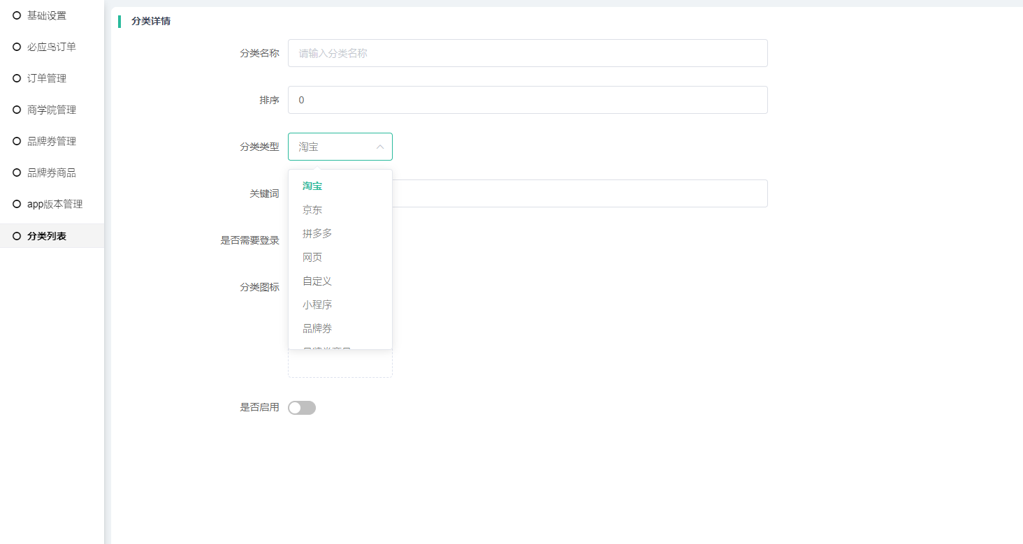 添加2级分类,名称、排序、图标、是否启用等规则同1、2级分类,关键在于区分不同的分类分类类型。